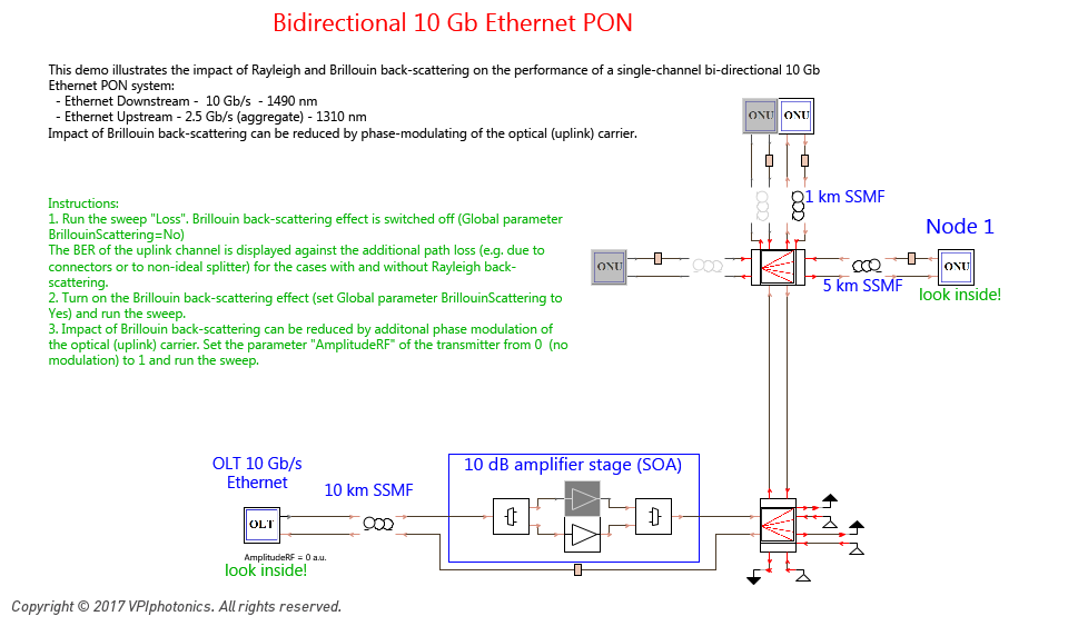 This demo illustrates the impact of Rayleigh and Brillouin back-scattering on the performance of a single-channel bi-directional 10 Gb Ethernet PON system.
